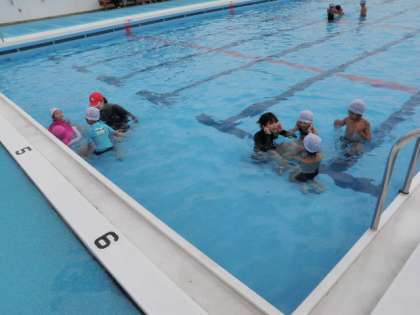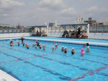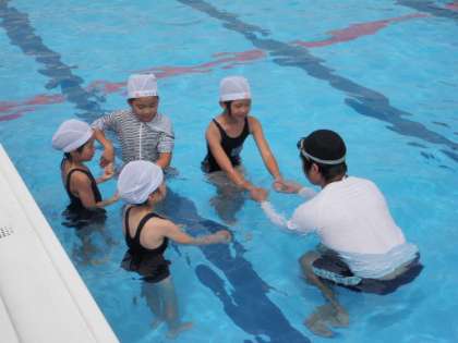 初心者水泳教室は、夏季休業中の水泳指導をより効果的に指導できるように、1年生の浮けない子どもたちを対象に計画されています。昨年、一昨年と天候が悪く、3年目でやっと実施することができました。22人の子どもたちが7グループに分かれて、先生が8名で指導しました。子どもたちは、皆一生懸命に取り組み、中には、2階級進級した子どもたちもいました。