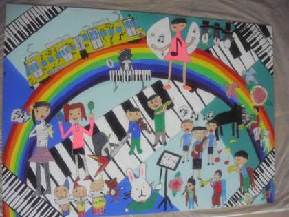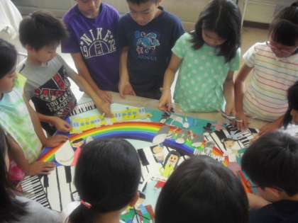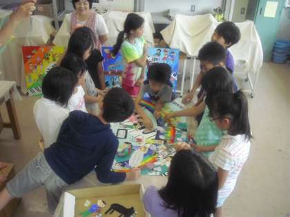 全版(78cm×110cm)の板にポスターの原画をアクリル絵の具で描きます。まず、子どもたちがそれぞれ描いてきた絵をみんなで見て、どの絵を載せるか話し合いました。次に、その絵をどのように組み合わせるのか話し合い、みんなで色を塗って完成しました。世田谷線内に貼り出されるのが楽しみです。