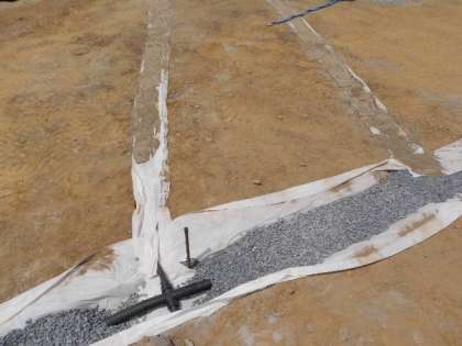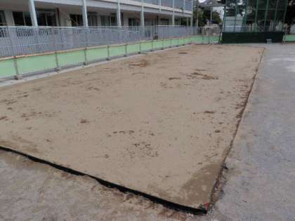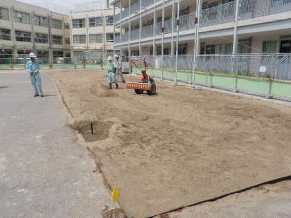 芝生にするところの土を20cm掘り、土を入れ換える土壌改良が進んでいます。また、写真の砂利のところは、排水するための透水管(黒い管)が埋められています。現在、半分以上の土壌改良が終了し、28日から芝張りが始まります。幅1m30cmのロール状の芝を張っていきますので、ご覧になるとおもしろいですよ。