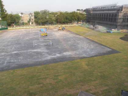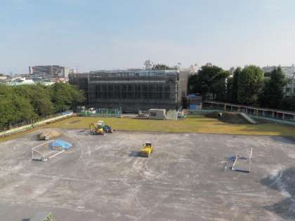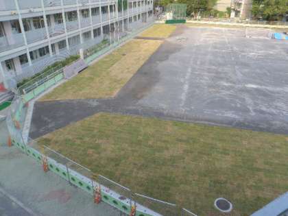 今日で芝生を全部張り終わりました。あとは、土の部分の整地〜転圧と、新しい6連の鉄棒設置で工事は、終了します。9月30日(月)の校庭使用開始が待たれます。