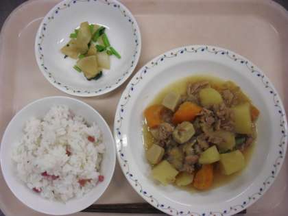 肉じゃがうま煮には、「豚肩肉・じゃがいも・人参・玉葱・凍り豆腐・こんにゃく・さやいんげん」が入っていました。赤・黄・緑と色分けしている食品群がバランスよく入っています。献立表をご参照ください。