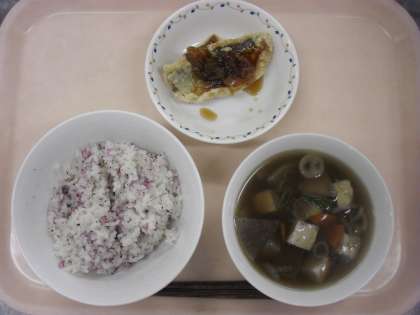けんちん汁のような具だくさんの汁は、赤・黄・緑の食品群がバランスよく入っています。今日のけんちん汁は、赤(鶏もも肉・豆腐)、黄(里芋・こんにゃく)、緑(ごぼう・人参・大根・葱)のように分類されています。