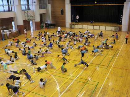 今日は、世田谷区立小学校教育研究会(世小研)体育部体つくり運動領域部会がつくったウゴウゴ体操2(音楽に合わせて体の基本的な動きを身に付ける体操)を行いました。音楽に合わせて運動すると、とても楽しくできますね。