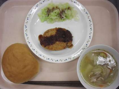 <丸パン・コロッケ・ゆでキャベツ・ベーコンと野菜のスープ・牛乳>