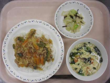 <スタミナ丼・キャベツの塩昆布かけ・かきたま汁・牛乳>