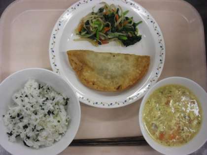 ★リクエスト1-2 ★ランチルーム4-2 <わかめごはん・ジャンボ餃子・おひたし・卵スープ・牛乳>