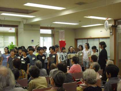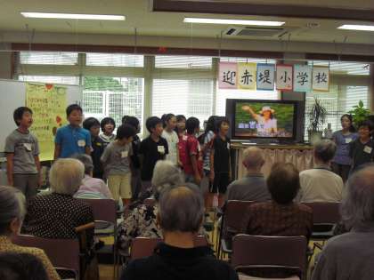 10月9日には5年2組が、10日には5年1組が、デイホームを訪問し、合唱をしたり、ゲームをしたり趣向を凝らして、ご高齢の方とのふれあい活動をしました。