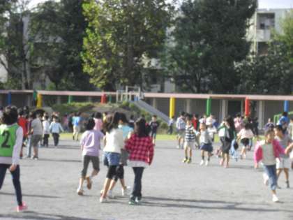 集会委員会の児童が企画し、「手つなぎおに」を全校児童が楽しみました。