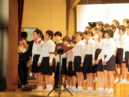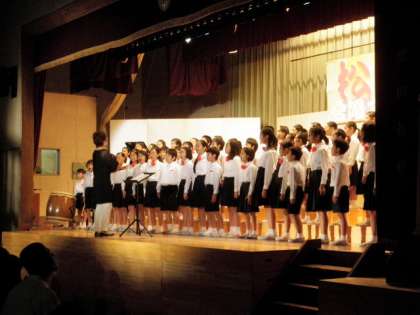 今年も、「世田谷9年教育」の一環として、松中祭に本校合唱団が出演しました。中学3年生の学年合唱、クラス発表を鑑賞した後、中学に兄姉がいる6年生2名が歌の紹介をして、59名の合唱団員が「ふるさと」「村祭り」「もみじ」を歌いました。中学生は、いろいろな場面で盛んに拍手をしてくれました。今日がデビューの3年生もいましたので、子どもたちは、満足そうな笑顔を浮かべていました。
