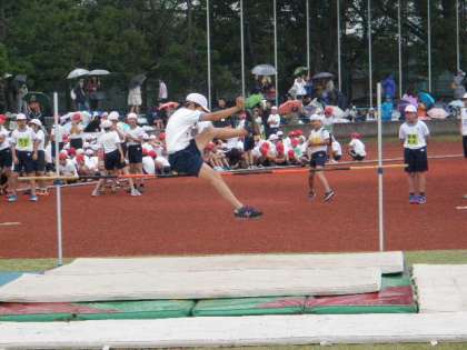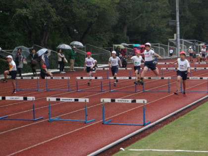 写真は、男子走り高跳び、男子50mハードル走、男子100m走の様子です。