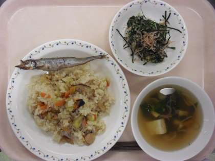 <秋の香りごはん・焼きししゃも・ほうれん草の乾物あえ・すまし汁・牛乳>