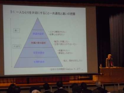 研究発表会は、教育委員長 岩谷力様のごあいさつの後、世田谷区立小学校研究会 会長 青木由美子様のごあいさつをいただきました。その後、本校研究主任の宮崎ゆずら主幹教諭の研究発表を行いました。小学校、中学校9年間を見通した教科「日本語」の授業づくり、交流活動を工夫した授業づくり、教科「日本語」と他教科とのつながりを踏まえた授業づくりについて発表しました。その後、世田谷区教育委員会事務局 教員指導課長から、「9年間を見通した系統的に授業、他教科等との横断的な授業は大切であり、交流活動の試行錯誤による工夫は、言語活動のスタンダードとして活用することができる」とのご講評をいただきました。その後、統合的心理療法研究所 所長 平木典子先生のご講演をいただきました。小学校で身につける「自己表現力」のポイント、アサーションとはどのようなことなのか、コミュニケーションの三つのパターンについて等、貴重なご講演をいただきました。