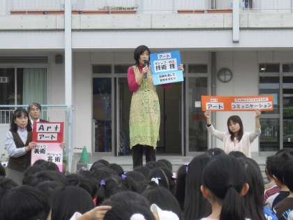 はじめに、図工専科の田邉理恵教諭が、11月15日、16日に行う学習発表会のテーマ「色や形で思いを伝えよう」について話しました。
