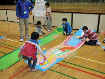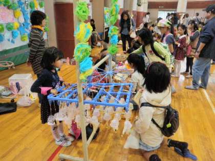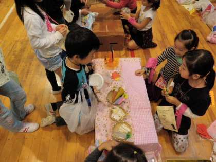 写真の店は、「ハッピーハンバーガー」「キラキラてん」「ファイヤーパターゴルフゲーム」の様子です。
