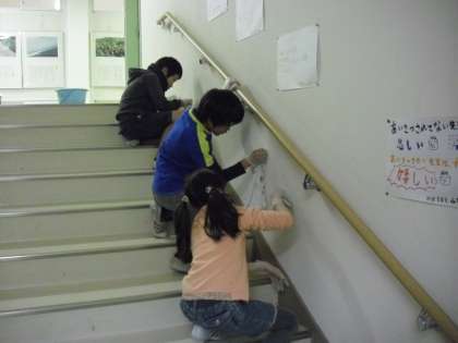 階段の壁を3週間ほど前にペンキで塗り、きちいにしたところですが、ところどころ汚れが目立つので、学年ごとに割り当てを決めて、掃除の時間に清掃しました。