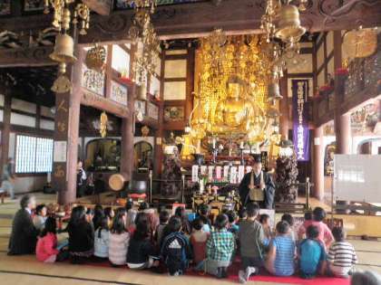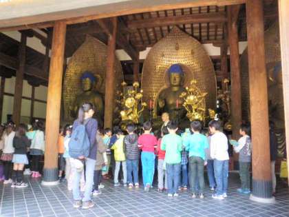 二つ目の見学は、九品仏浄真寺でした。境内の紅葉が素晴らしかったです。子どもたちは、組ごとに閻魔堂、本堂、三仏堂を見学し、説明してくださったお坊さんの話を熱心にメモしていました。