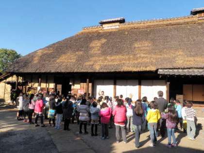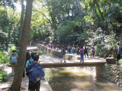 その後、等々力渓谷を歩き、玉川野毛町公園で昼食をとり、次大夫堀公園を見学しました。次大夫堀公園では、子どもたちは、昔の家々を自由に見学し、昔の様子を感じとっていました。