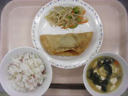 今日の給食は、2年2組のリクエスト献立でした。全員に主食・主菜・副菜・デザートに分けてリクエストを書いてもらった集計結果は、主食「1位:あげパン、2位:梅ごはん」、主菜「1位:ジャンボぎょうざ、2位:コロッケ」、副菜「1位:大豆とじゃこの甘辛揚げ・コーンスープ、2位:こんにゃくサラダ」、デザート「1位:冷凍みかん、2位:アイス)」