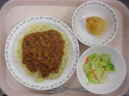 ★校長室会食10C <スパゲティミートソース・コーンサラダ・柿・牛乳>
