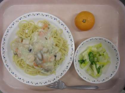 ★校長室会食14B <スパゲティシーフードクリームソース・りんごと白菜のサラダ・みかん・牛乳>