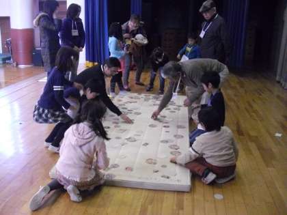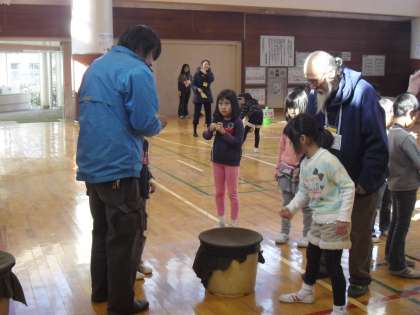 地域・保護者の方々、50名近くの方々に、こままわし、竹とんぼ、羽つき、めんこ、あやとり、お手玉、だるまおとし、竹馬等を教わりました。