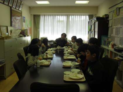 今日明日は2年1組のランチルームです。各自コースターを作ってそこに牛乳びんをのせ、音楽をかけてランチルームを楽しんでいました。校長室会食はいつも和やかな雰囲気で行われています。今日の給食は、4年3組のリクエスト献立でした。この組み合わせは大変人気があります。