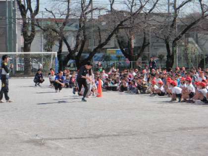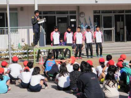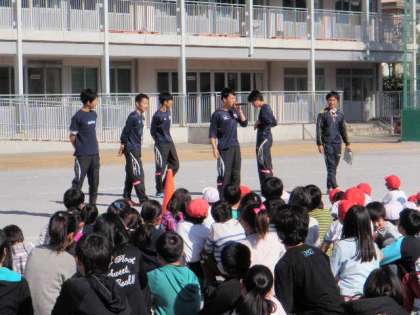 日本大学陸上競技部駅伝部員が5名ランニング教室に来てくださいました。5名の中には、第90回箱根駅伝に出場した選手3名、第45回全日本大学駅伝に出場した選手2名がいました。まず選手に走っていただき、走り方を勉強しました。次に、子どもたちと一生に走り、最後は、代表の子どもたち、先生たちと競走しました。10km30分を切る(50m8秒のスピードで10km走る)選手たちですから、先生たちも全く歯が立ちませんでした。3・4年の5学級で一緒に給食を食べ、子どもたちと交流してくださいました。