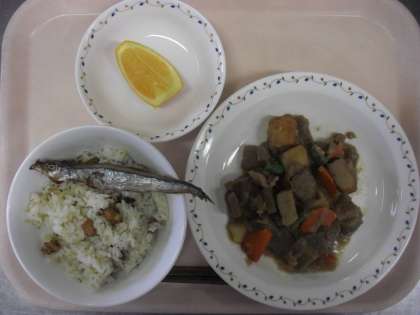 今日は節分の日なので、豆入りごはんでした。いわしの丸干しの代わりに焼きししゃもを食べました。2月はいろいろな柑橘類の果物を出していきます。
