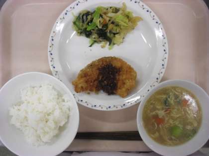 ソースがかかったフライは、白いごはんがよくすすみました。チーズのふわふわスープは、チーズの風味がきいた卵スープです。