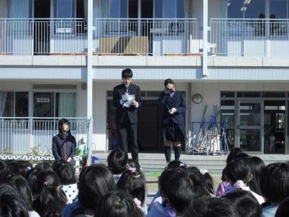 はじめに、松沢中学校の生徒会の代表生徒が、3月21日の赤松学舎小中交流イベントである「松中へ行こう」について説明して、お知らせしました。