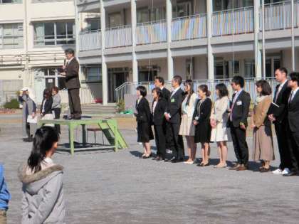 校庭の桜も咲き続ける中、平成26年度着任式・始業式が行われました。着任式では、退職者3名、転出者5名、転入者6名が紹介されました。