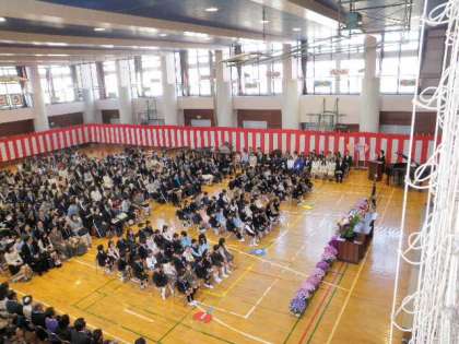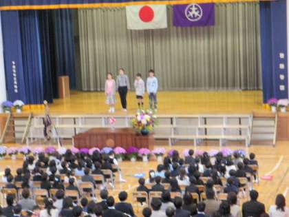 10時から89名の新入生を迎え、入学式が行われました。新入生は、6年生の歌声の中、27名の来賓、多数の保護者に迎えられ入場しました。校長より三つのお願い「早起き早寝」「好き嫌いなくしっかり食べること」「一日1時間以上運動すること」の後、新6年生代表委員の「歓迎の言葉」、新2年生の「歓迎の演技」と続きました。