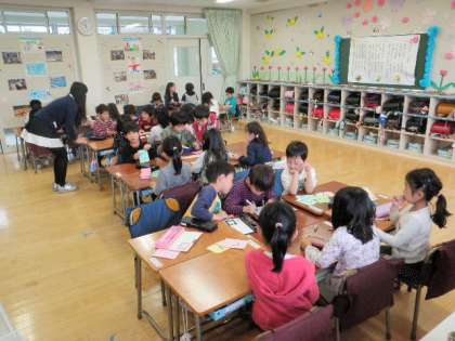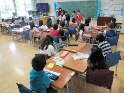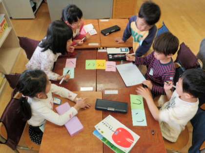 今日は「い、こ、く、と、へ、し、り、そ、つ」を使った言葉を見付ける授業でした。「自分でしゃべること」「友達に伝えること」がねらいで、子どもたちは、一生懸命言葉を見付けては友達に話していました。先生の一言一言に体で反応する子どもたち、見ていて自然と笑ってしまいました。
