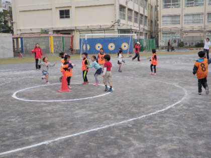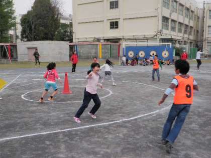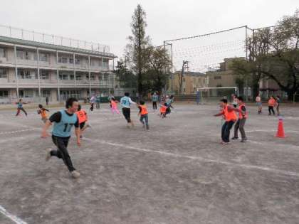 赤堤小学校地域運営学校の体育プロジェクト第1弾として、スポーツ鬼ごっこ体験教室が行われました。1年から6年までの児童55名と、保護者7名、教員3名が参加し、5分交替でゲームをしました。相手方の宝を取りに行きながら、自陣の宝を守るゲームですが、動きが非常に多く、肥満解消目的で作られたゲームということがうなずけます。