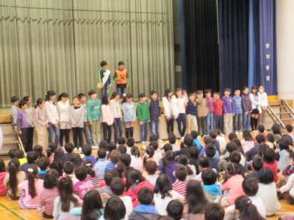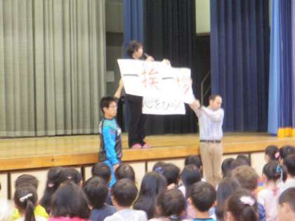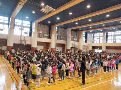 今日は、6年1組の宮崎先生の「一挨一拶」の話でした。お坊さんの修行で使われる言葉で、問答を交して相手の悟りの深浅を試みることだそうです。皆さんも心を開いてあいさつしましょう、と結ばれました。
