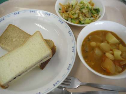 ※給食だよりにはいちごジャムと記載されていますが、ブルーベリージャムに変更にしました。(二色サンドに使用)