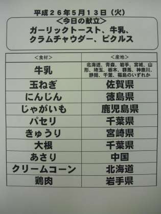 5月13日(火)の給食食材産地について
