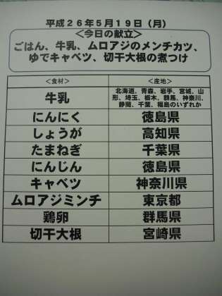 5月19日(月)の給食食材産地について