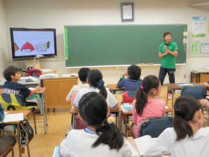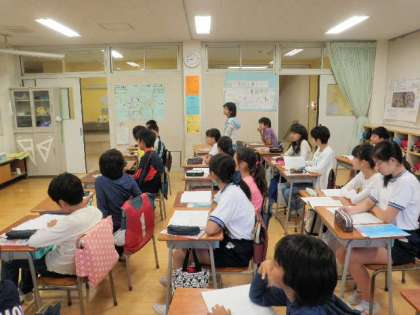 「はい、たつ、です」を合言葉に授業が進みます。「はい」と返事して「立って」答えて「です」○○です、と話します。この単元は、チャレンジ1、チャレンジ2、しっかり、じっくりの4つに分かれて授業をしています。3学級の子どもたちがいましたが、先生と子どもたちの様子が自然で、一つの学級と変わらない感じがしました。