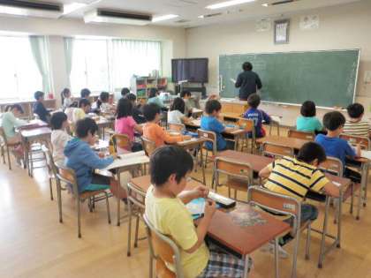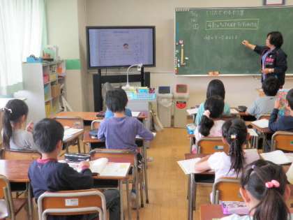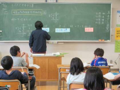 新しい単元「1けたでわるわり算」に入ったため、新しいグループでの授業でした。この単元は、3グループ、26〜27人の均等分けで授業が進みます。単元の初めなので、再度ノートの書き方や下敷きについて指導がありました。また、50型TVを利用しての授業でもありました。今日のポイントである、たてる⇒かける⇒ひく、たしかめのしかたについて、再三確認の声掛けがありました。
