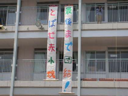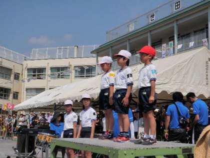 写真は、1年生による児童代表の言葉、代表委員会作成のスローガン「最後まで団結!とばせ 赤小魂」です。1年生にとって、小学校初めての運動会。一人ひとりがしっかり目標を言うことができました。