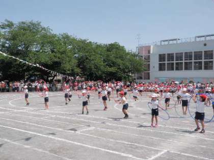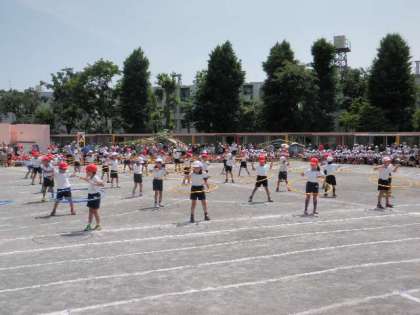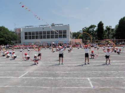 2年生恒例の輪を使った団体演技です。腰で回したり、ブリッジをしたり、跳んだり、転がしたり、ウェーブしたり、3色の輪を使い多彩な演技を見せてくれました。