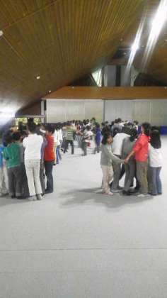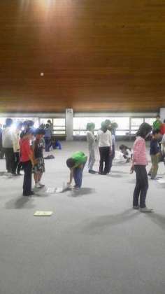 村の会堂で室内レクを行いました。人間知恵の輪、爆弾ゲーム、新聞乗りゲームで楽しみました。雨が降っても、みんなと一緒だと楽しいですね。