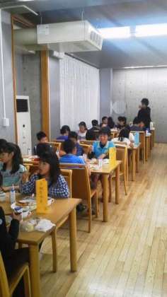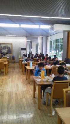 今日の朝食は、白パン、イチゴジャム、ソーセージ、ハッシュポテト、コールスローサラダ、ドレッシング、みかんゼリー、牛乳です。子どもたちのプレートは、空っぽの子が多いです。この後、部屋の片付け後、閉室式があります。