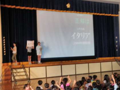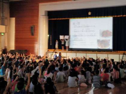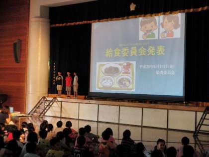 今日の児童集会は、給食委員会の発表でした。給食が9人の調理員の皆さんによって、どのようにして作られるのか、写真を使って発表しました。また、献立は栄養士さんが考え、世界の国(アメリカ、スペイン、イタリア、ロシア、韓国)の料理も食べていることを、クイズ形式で紹介してくれました。