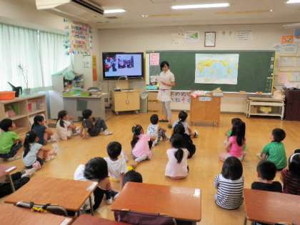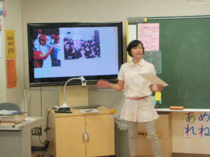 1年3組にはインドネシアの留学生で、インドネシアの場所、言葉(あいさつ、学校、鉛筆、消しゴム)、ゲームなどを教えてくださいました。1年生は外国の方と接するのが、初めての子もたくさんいました。でも、ゲームでは盛り上がり、クラス全体が一体となっていました。