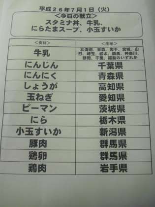 7月1日(火)の給食食材産地について