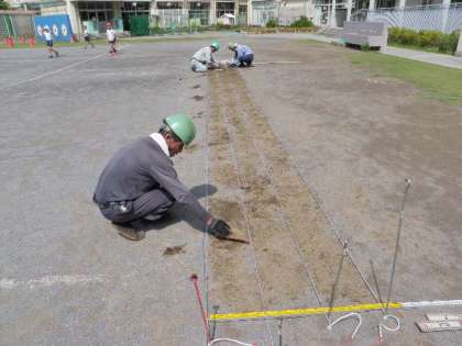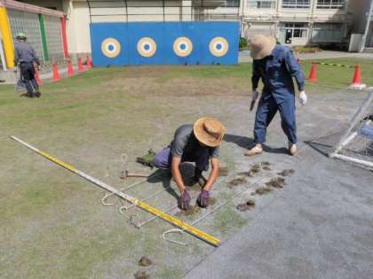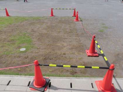 11日からようやく校庭芝生の補修が始まりました。12日と14日にも行います。ポット苗を等間隔に植えていきます。補修場所は、校舎前、的当て板前、バスケットゴール前、行事門近くのサッカーゴール付近です。子どもたちがたくさん遊んでいた場所が大部分です。4週間ぐらい補修場所には入れませんが、ボールを取りに入るのは、大丈夫です。