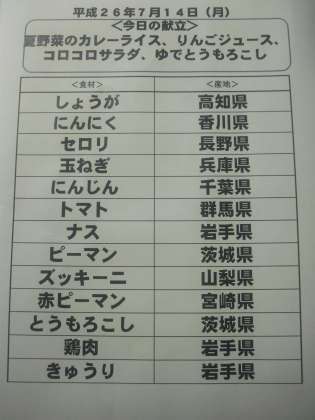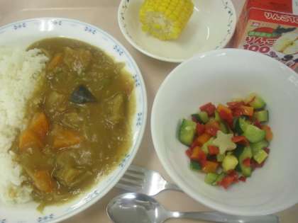 ※献立表に記入がありませんが、コロコロサラダに星形のパイナップル缶(タイ産)を追加しました。よろしくお願いします。