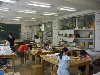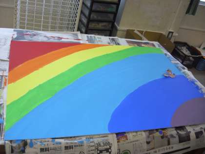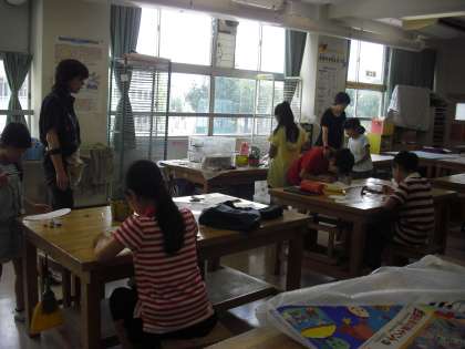 西校舎2階の図工室には、絵筆を片手に子どもたちが集まっています。世田谷線内ポスターをかくためです。今年のテーマは、「山下秋の味覚まつり」です。子どもたちのイメージする秋の味覚とは一体どんなものなのでしょうか。それぞれのアイディアを持ち寄り、78cm×110cmの大きな板にポスターの原画をかきます。アクリル絵の具を使いながら、楽しそうに絵をかく子どもたちでした。